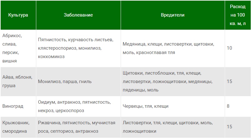 Ces cultures fruitières nécessitent la concentration de médicament la plus élevée - 15 litres par 0,1 ha. Avant la pulvérisation, recouvrez le sol d'une bâche ou de polyéthylène afin que la solution ne pénètre pas dans le sol. Une attention particulière doit être portée à la procédure si elle a lieu à proximité immédiate de cultures maraîchères ou florales.