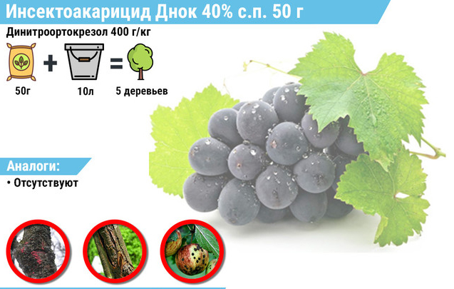 L'utilisation du « DNOC » en viticulture offre un certain nombre de caractéristiques. Avant la procédure, la plante doit être éclaircie en coupant les pousses inutiles. Cela aide à arrêter la multiplication des micro-organismes pathogènes et des larves d'insectes. Il est nécessaire de traiter les raisins avec un fongicide au début du printemps, avant que les jus ne commencent à bouger, à raison de 8 litres de médicament pour 0,1 hectare. Ainsi, la culture sera protégée pendant toute la saison de l'oïdium, des taches, de la cercospora, de l'anthracnose et de la nécrose. Les tiques, les pucerons et les vers ne toléreront pas non plus le traitement.