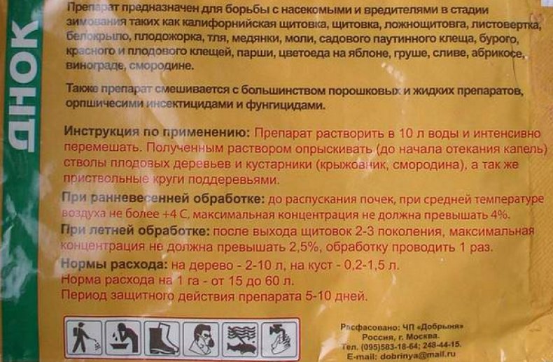 Insectofongicide « DNOC » fait référence à des médicaments de classe de toxicité élevée. Avec de la poudre sèche, ainsi qu'avec une solution, il est nécessaire de travailler très soigneusement, en respectant les précautions de sécurité. Le dinitroorthocrésol en combinaison avec des solvants organiques est un mélange explosif. D'après les instructions sur l'emballage, il s'ensuit que le produit n'est pas destiné aux parcelles de jardin privées, mais de nombreux jardiniers ignorent cette interdiction.