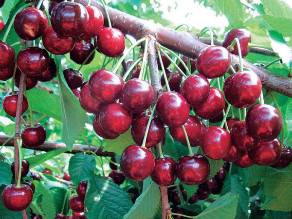 Les fruits sont de forme ronde, mais légèrement aplatis. Les baies ont une taille moyenne - environ 5 g. Mais il peut y avoir de gros spécimens atteignant 7 g. La peau est dense, brillante, écarlate foncé, presque noire. Il y a une petite tache blanche à la base de l'apex. La pierre est de forme ovale, bien séparée de la pulpe. La pulpe est dense, de couleur rouge foncé.