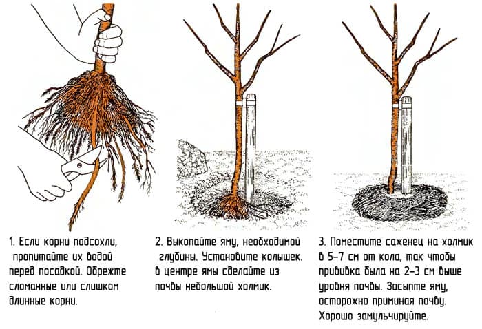 Avant la plantation, il est impératif d'inspecter le plant. Vous pouvez choisir un arbre d'un an et un arbre plus âgé (2-3 ans). Les racines doivent être saines, fortes, exemptes de dommages et de zones sèches. Aussi, en bas, le lieu de vaccination doit être perceptible. Sinon, vous courez le risque d'élever un gibier sauvage.