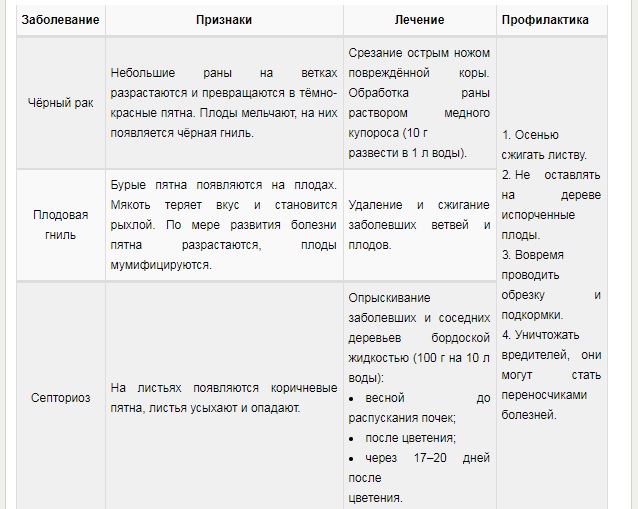 La variété a un haut degré de résistance aux maladies et aux ravageurs. Cependant, la violation des règles de soins peut provoquer leur apparition. Cela peut être évité à l'aide de mesures préventives simples, à savoir un traitement printanier opportun avec des préparations et des insecticides contenant du cuivre. Bordeaux liquide, sulfate de cuivre, "Decis" et "Fufanon" feront parfaitement face à cette tâche.