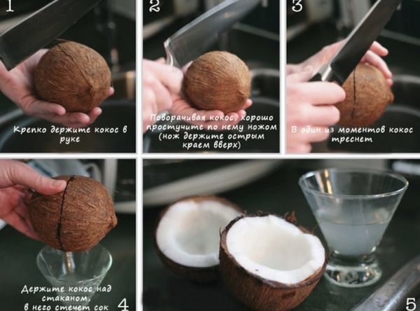 Pour cette méthode, vous devez préparer le plus grand couteau. La noix de coco doit être placée dans un récipient profond car le jus s'écoulera du fruit. Ainsi, sur la noix de coco, vous devez trouver l'endroit où les deux moitiés se rencontrent et y placer le tranchant du couteau. Le couteau doit être enfoncé lentement mais fortement dans la "couture" et tapoté, et le fruit doit être soigneusement fait défiler dans les mains. Cette procédure doit être poursuivie jusqu'à ce que le fruit se fissure. Cette méthode est assez traumatisante.