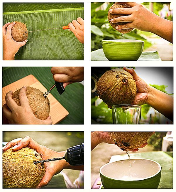 Donc, vous devez d'abord drainer le "lait" contenu dans le fœtus. Cela nécessite un tire-bouchon. Il doit être vissé lentement et soigneusement dans la coque. À partir du trou obtenu, versez le contenu de la noix de coco dans un récipient préalablement préparé.