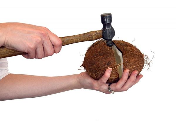Ensuite, vous devez hacher la noix de coco. Un marteau ordinaire vous aidera. Ils doivent tapoter légèrement sur toute la surface du fruit. Une attention particulière doit être portée à l'endroit où le tire-bouchon est vissé, car c'est là qu'il sera plus facile de faire une fissure.Après son apparition, il ne sera pas difficile de diviser le fœtus en deux moitiés.