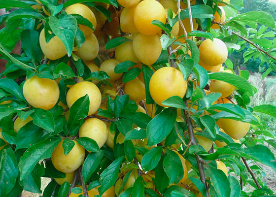 La prune au miel appartient aux variétés hautes et peut atteindre 3 à 5 m. Les fruits sont ronds, jaune vif, très sucrés. La pulpe est ferme, avec un os difficile à enlever. La période de maturation est le milieu de l'été.