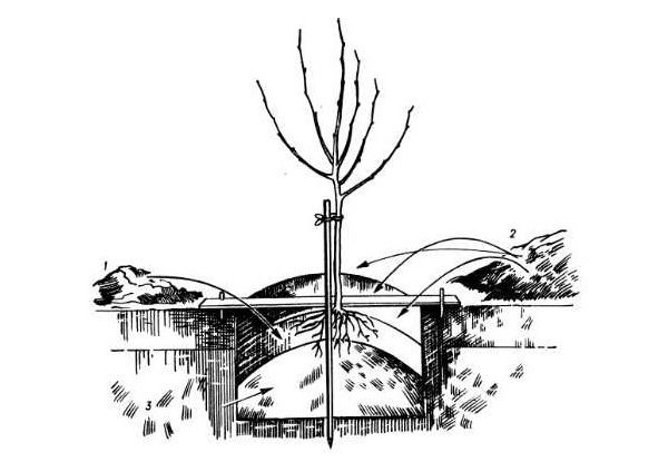 - Former une dépression dans le trou de plantation. La taille de la dépression doit correspondre aux paramètres du système racinaire du jeune arbre.