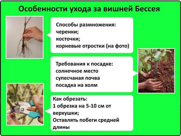 Les règles de plantation et d'entretien du Bessei sont similaires à celles fixées pour les cerises classiques. Si le système racinaire d'un arbuste est ouvert lors de l'achat d'un semis, il doit être planté au printemps. Pour les racines fermées (situées dans un conteneur), la plantation de cerises de Bessey au début de l'automne est caractéristique. Lorsqu'une grande quantité de neige tombe en hiver, il est nécessaire d'en débarrasser soigneusement l'arbuste à l'aide de la technologie agricole.