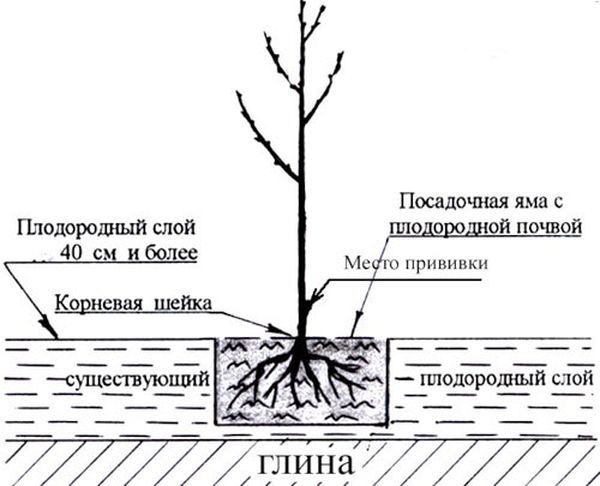 L'intervalle entre les fosses doit être de 3 m. Le diamètre de l'évidement est de 1 m et la profondeur est de 0,8 m. Les couches supérieures du sol sont mélangées à de l'humus pour augmenter la fertilité du sol. Un piquet est installé au centre de l'évidement, auquel un plant est ensuite attaché. Il est important de répartir le système racinaire de la plante sur toute la surface de la fosse.