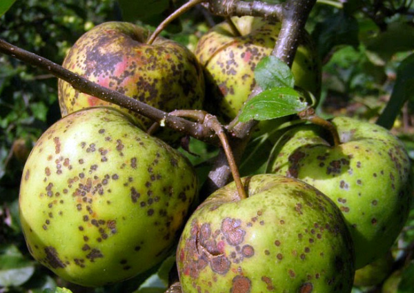 La gale est une autre maladie fongique. Il apparaît souvent sous forme de taches claires sur les jeunes feuilles, qui avec le temps se couvrent d'une floraison brun olive, puis noircissent. Les parties malades de l'arbre se fanent progressivement, se dessèchent puis meurent. La première étape consiste à arracher les parties infectées et à les incinérer. Les arbres doivent être pulvérisés avec la préparation Zircon, et le sol dans le cercle du tronc doit être déterré et arrosé avec une solution de nitrate d'ammonium à 10%.