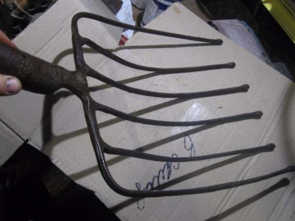 Une version plus simple d'une fourche à faire soi-même peut être fabriquée à partir de fil. Coupez du fil d'acier de 6 à 8 mm de diamètre en morceaux de trente centimètres. Meulez chaque morceau d'une extrémité à la netteté. Souder avec des extrémités non coupantes sur une barre d'acier, du côté opposé aux dents, souder une rainure pour le manche. Il peut être fabriqué à partir d'un morceau de vieux tuyau.