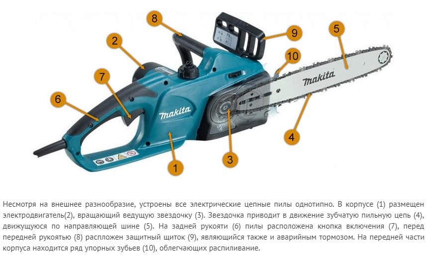 La tronçonneuse à alimentation secteur a une construction standard. À l'intérieur du boîtier en plastique ou en métal, il y a un moteur qui est responsable de la rotation du pignon d'entraînement. Le pignon, à son tour, démarre la chaîne de scie dentée. Les dents de butée à l'avant du boîtier facilitent la coupe du bois.