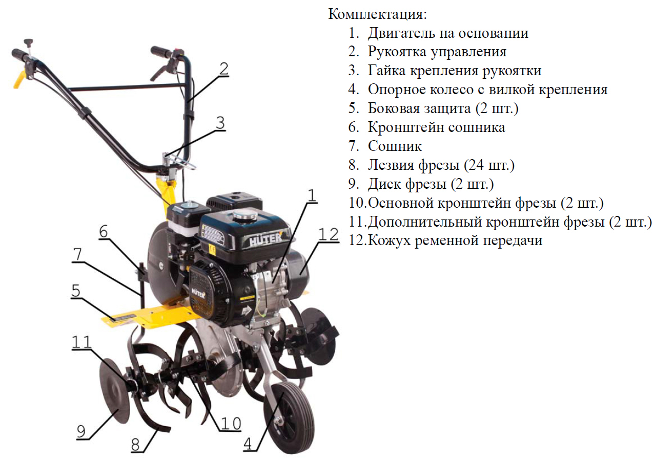 Par défaut, l'équipement de base d'un motoculteur se compose des éléments suivants :