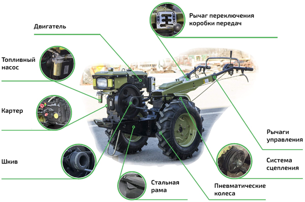 Le poids moyen d'une telle unité est de 120 kg. La puissance du moteur varie de 6 à 12 ch. avec. La plupart des modèles sont équipés d'un moteur diesel 4 temps. Contrairement à leurs homologues à essence, les unités diesel ont une efficacité plus élevée.