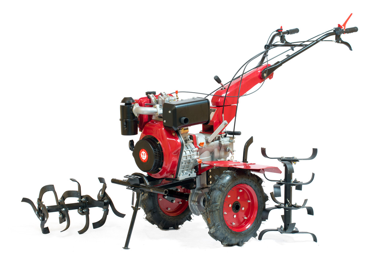 Tracteur diesel à conducteur marchant fiable pour le traitement de territoires jusqu'à 5 hectares. L'unité est capable d'effectuer des travaux agricoles de différents niveaux de complexité : labour, travail du sol et ameublissement du sol, buttage des plantes, désherbage des rangs et tonte de l'herbe.