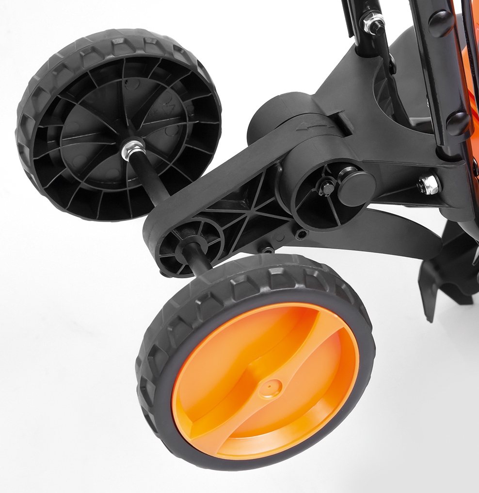 Les roues de transport situées à l'arrière facilitent le transport et les déplacements dans la zone du cultivateur électrique.