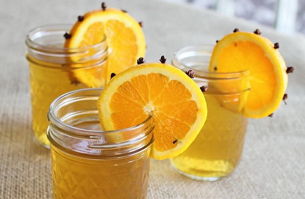 Prenez un demi-verre de miel et de sucre, 4 oranges, des feuilles de menthe, 1 citron, 30 ml de jus de citron, 8 poires et 3 clous de girofle.