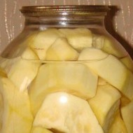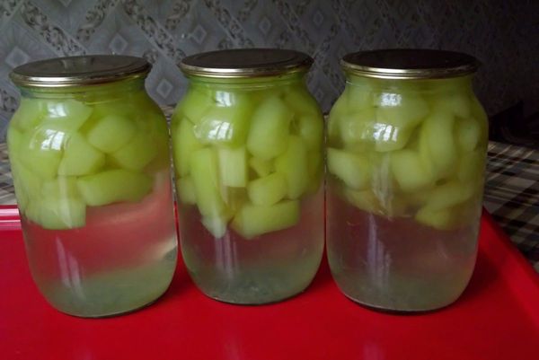 Lavez les légumes. Retirez délicatement les graines et coupez-les en cubes. Transférer les tranches dans une casserole et couvrir d'eau. Incorporer le sucre et porter à ébullition. Ajouter les épices et le vinaigre. Stériliser les banques. Versez le bouillon obtenu uniformément dans le récipient. Roulez et couvrez les boîtes avec une couverture. Rangez la pièce dans un endroit frais et sombre.