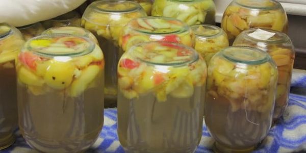Rincer les fruits frais. Les courgettes pré-nettoyées et hachées, ainsi que les fruits, sont envoyées dans le bocal. Versez le sucre et versez de l'eau bouillante chaude dessus. Revissez les couvercles et secouez les bocaux pour mélanger le contenu. Après avoir enveloppé une couverture, laissez refroidir. Mettez le produit fini sur les étagères du garde-manger.