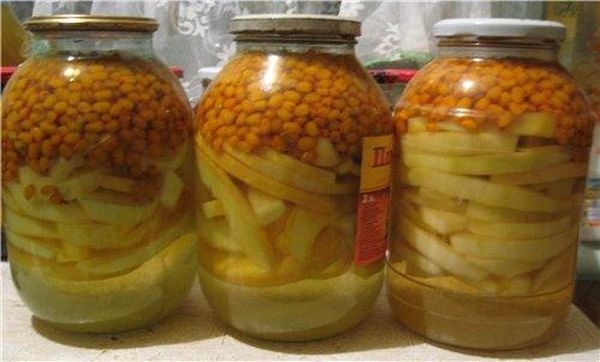 Cette recette ne peut être utilisée qu'au début de l'automne. Le fait est que l'argousier mûrit en septembre et que les courgettes portent des fruits jusqu'au milieu du mois. Mais vous obtenez une boisson en conserve riche en vitamines utiles. Il deviendra un moyen efficace de prévenir les rhumes et les maladies cardiovasculaires.
