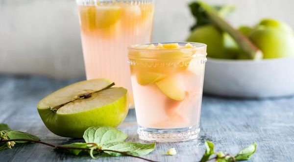 Prenez 250 g de pommes et de rhubarbe chacune, 3 litres d'eau, du sucre - à votre goût, de la menthe, de la cannelle et du zeste de citron - si vous le souhaitez.