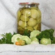 Les fruits propres sont placés dans une casserole de taille appropriée, remplie d'eau bouillante. Après 6 minutes, la courge doit être refroidie dans un récipient avec de l'eau froide. N'oubliez pas d'ajouter du vinaigre à la marinade bouillie. Une partie des légumes verts et du poivre sont placés au fond d'un pot d'un litre, les courges et les légumes verts qui restent y sont également envoyés. Après avoir stérilisé les bocaux (environ 20 minutes), ils peuvent être fermés hermétiquement avec des couvercles.