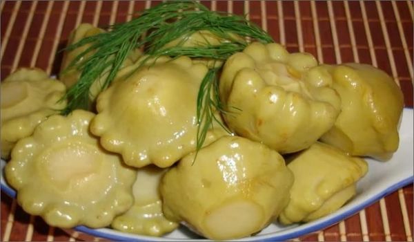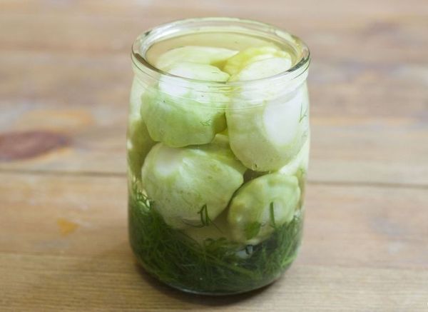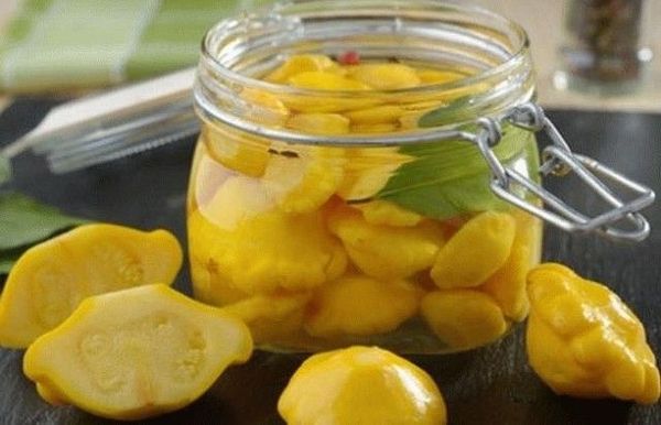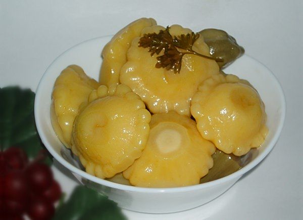Les courges lavées sans queue sont bouillies pendant environ 3 minutes dans de l'eau déjà bouillie dans un récipient séparé, puis égouttées. La marinade est faite dans un récipient différent. Lorsque la composition bout, vous devez verser du vinaigre, mettre du poivre et des clous de girofle. Les patissons sont placés dans des bocaux, des feuilles de laurier, de l'ail pelé et haché y sont envoyés, vous pouvez ajouter de l'aneth ou du raifort. La pièce est versée avec de la marinade et fermée avec des couvercles à vis ou en nylon stériles.