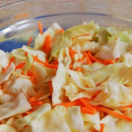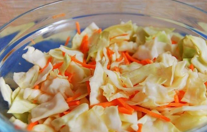 Tout d'abord, le chou doit être coupé en fines tranches. Pour ce faire, vous pouvez utiliser un broyeur spécial ou un couteau ordinaire. À la suite de ces manipulations simples, une sorte de "paille" devrait se révéler. Les carottes doivent être lavées, pelées et râpées sur une râpe grossière. Eplucher l'ail et passer au pressoir. Tous les composants préparés doivent être combinés dans un pot de trois litres, soigneusement scellé.
