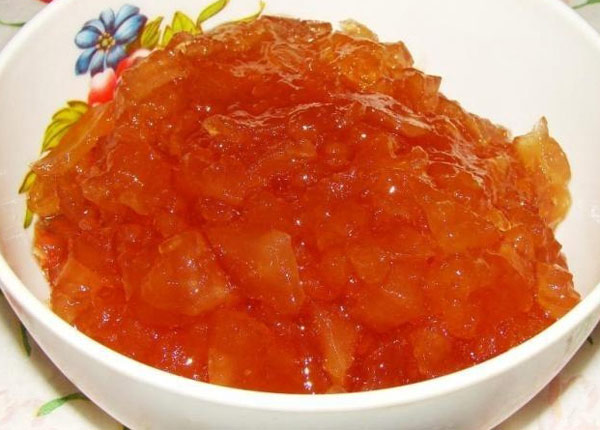 L'essentiel est de garder le feu lent, d'éviter de remuer brutalement avec une cuillère, il est préférable de secouer la vaisselle de temps en temps. La confiture entièrement préparée dans des récipients est disposée au froid, recouverte de couvercles ou même de parchemin, conservée au froid.