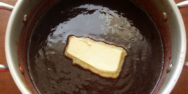 - Faire bouillir avec un mélange de consistance épaisse jusqu'à acquisition, ajouter le cacao et le beurre et cuire encore 12 minutes en remuant constamment.