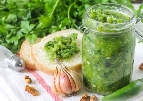 Adjika est appelé vert en raison de la recette, au cours de laquelle l'assaisonnement prend une couleur riche. Il est préférable de le servir comme sauce pour la viande.