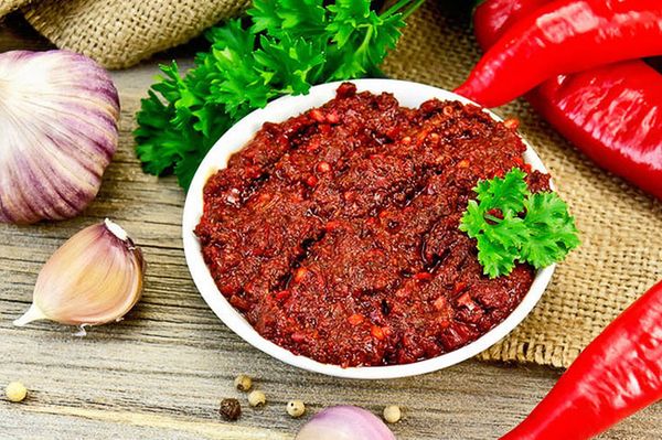 L'adjika abkhaze peut être préparé comme préparation pour l'hiver ou sans utilisation de températures élevées. Il se marie bien avec les plats chauds.
