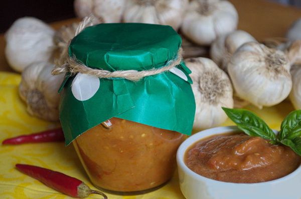 Les légumes déjà cuits sont hachés avec un mélangeur, à nouveau portés à ébullition, disposés dans des bocaux stérilisés et serrés avec des couvercles. Une savoureuse préparation pour l'hiver est prête.