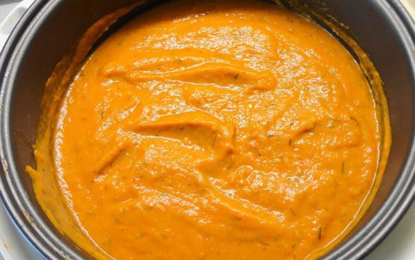 Ajouter la pâte de tomate, le sucre, les épices. Fermez le multicuiseur et réglez le mode mijotage pendant 2 heures. Remuer toutes les 15 minutes.