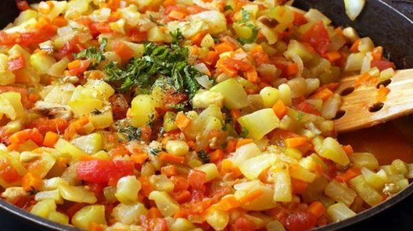 Râpez tous les légumes ou hachez-les avec un couteau. Mettez tous les ingrédients dans une poêle préchauffée, sauf les épices, versez un peu d'huile de tournesol. Laisser mijoter à feu doux pendant un quart d'heure. Ajouter la sauce tomate ou le ketchup, le sucre, le sel, les épices. Laisser mijoter encore 5 à 10 minutes.