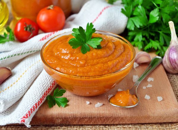Mettez les ingrédients finis dans un mélangeur et broyez jusqu'à obtenir une purée. Remettre la purée de légumes dans la poêle, ajouter le concentré de tomate et ajouter 3 cuillères à soupe d'huile. Laisser mijoter jusqu'à épaississement, environ 15 minutes. Lorsque la purée épaissit, ajoutez-y du sel, du sucre, des épices, laissez cuire encore 10 minutes.