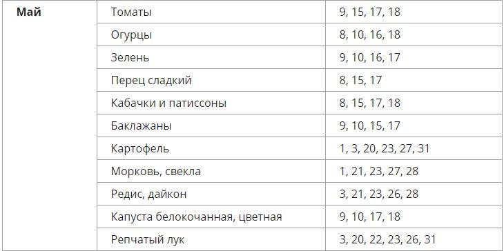 - 15-16 mai - les plantes plantées ce jour-là n'apporteront pas une récolte abondante, mais elles seront résistantes aux ravageurs et aux maladies. Les futures graines se conserveront bien jusqu'au prochain semis. Le greffage ou la pulvérisation n'est pas recommandé.