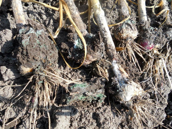 Si la pénicillose (moisissure verte de l'ail) apparaît dans le jardin, cela peut aussi être la cause de la pourriture. Des taches brunes aqueuses se forment sur le fond et l'enveloppe extérieure. Les clous de girofle individuels du bulbe sont affectés, s'estompant progressivement et se recouvrant de petites taches déprimées de couleur jaune foncé. Ces taches grossissent rapidement et se couvrent de moisissures blanches qui virent au vert au bout de quelques jours. La cause du développement est une humidité élevée associée à une température élevée.