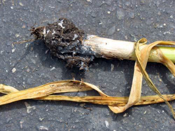 Une autre raison pour laquelle l'ail pourrit est la pourriture blanche du fond. La maladie se développe activement avec un arrosage abondant, lorsque l'humidité du sol est trop élevée, cependant, contrairement au fusarium, une température de l'air basse est nécessaire pour sa propagation. L'ail d'hiver est menacé au printemps, lorsque la neige commence à fondre. Les feuilles et les tiges d'ail jaunissent abondamment, se dessèchent rapidement et tombent. Dans la partie racinaire de la plante, un mycélium blanc se forme, c'est-à-dire le mycélium, qui infecte le sol avec des spores. Les racines meurent avec le temps et les clous de girofle du bulbe pourrissent.