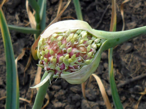 On remarque que dès que ces pousses denses sont enlevées, les bulbes repoussent, et au contraire, s'ils ne sont pas enlevés du tout, les têtes deviendront petites et le rendement global diminuera d'un tiers. Un autre point négatif est que la maturation de l'ail avec des flèches est retardée de 2 semaines, voire plus.