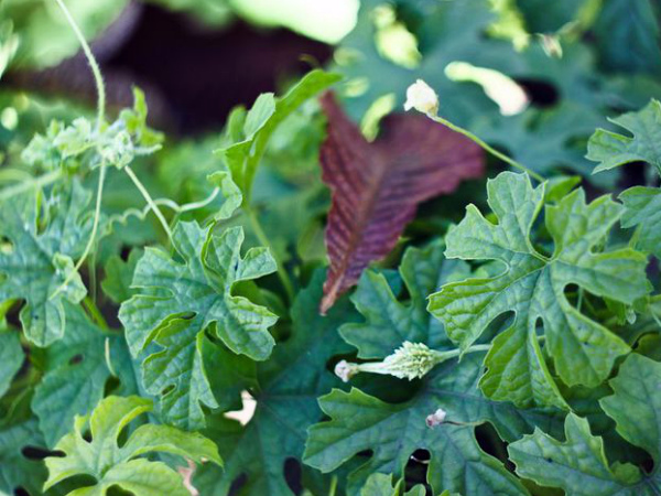 Les pousses élancées mesurent jusqu'à 4 mètres de long et sont suffisamment solides pour contenir de grandes feuilles sculptées d'un vert vif. Les fleurs jaunes fleurissent à leur tour - d'abord pour les hommes avec un agréable parfum sucré, puis pour les femmes. Presque immédiatement après la pollinisation, les ovaires se forment, de gros fruits verts se développent, semblables à des concombres verruqueux, à mesure qu'ils mûrissent, ils acquièrent une couleur jaune-orange.