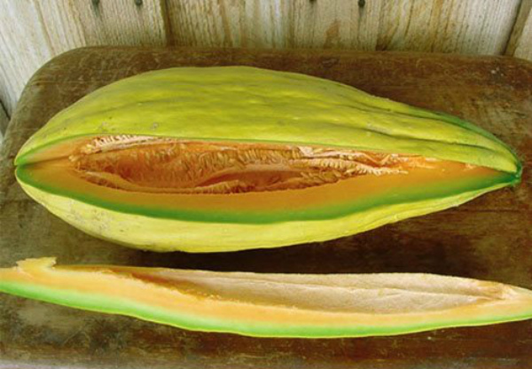 Cependant, il existe une différence significative - en termes de couleur de la pulpe, la variété Banane ne ressemble pas du tout à un fruit. A l'intérieur, un melon banane est doré, presque rouge, avec un bord verdâtre sous la peau. Le melon banane est considéré comme le plus inhabituel non seulement dans son pays d'origine, mais dans le monde entier.