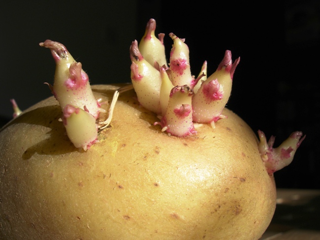Parfois, les tubercules de pomme de terre peuvent commencer à germer seuls. Dans le même temps, il ne faut pas permettre l'apparition de germes trop gros, car ils enlèvent non seulement beaucoup de vitalité nécessaire au matériel de plantation, mais sont également capables de se casser pendant la plantation. Vous pouvez simplement casser de telles pousses intempestives, ainsi, vous retarderez la germination des pommes de terre au bon moment. Et vous pouvez utiliser des pousses cultivées de manière inattendue comme semis. Car lorsque le germe atteint 4 à 6 cm de long, il a déjà l'étoffe de ses propres racines.