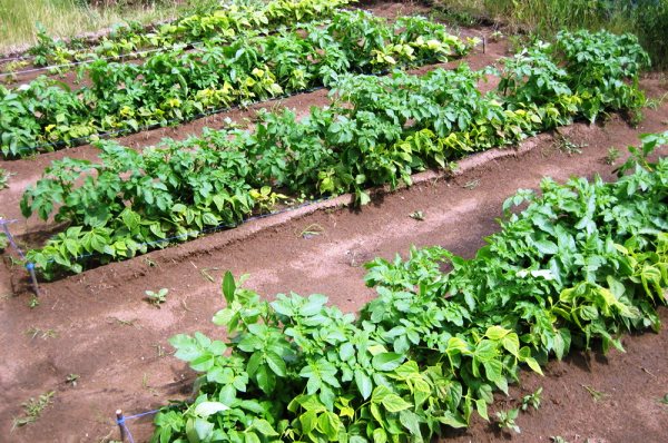 La pomme de terre est bien ventilée, reçoit beaucoup de soleil, car les plantes sont élevées au-dessus du sol.