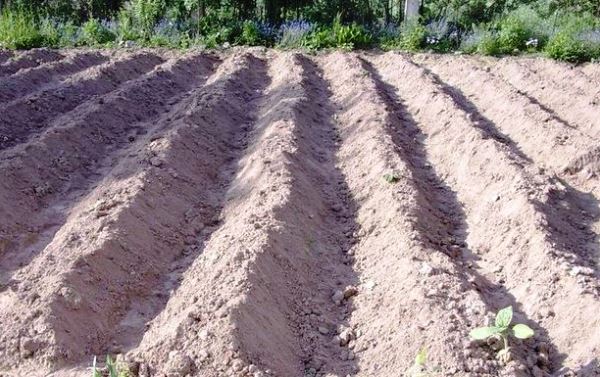 Avant de planter des pommes de terre sur les billons, de l'engrais et des cendres sont appliqués sur le sol. Les lits sont creusés pour que tout se mélange au sol. Ensuite, avec une houe, un tracteur ou un motoculteur, ils font des billons jusqu'à 15 cm de haut et y déposent les tubercules germés à 25-30 cm les uns des autres. La distance entre les crêtes est de 70 cm.