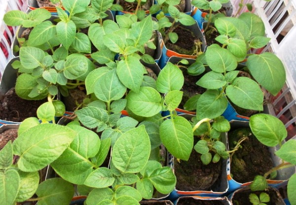 Les semis sont issus de tubercules variétaux sains, qui germent à la lumière pendant un mois puis plantés dans des caisses ou des petits pots avec un mélange de tourbe. Lorsque les plantes atteignent 7 à 10 cm (cela prendra environ trois semaines), elles, ainsi que les tubercules, sont sélectionnées et transplantées dans les trous. La distance entre les trous est de 20-25 cm, entre les rangs est de 50 cm.Les tubercules sont plantés à une profondeur telle que les sommets restent au-dessus du sol. Les semis sont plantés dans des billons, dans des tranchées et sous une pelle - tout dépend des conditions de votre site.