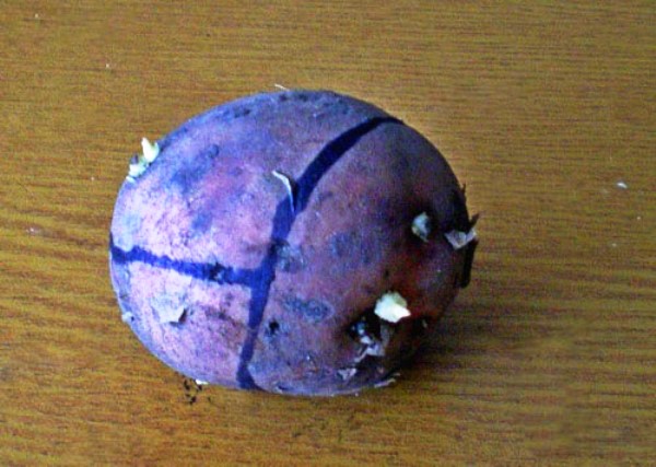 Habituellement, pour cela, les boîtes sont sorties dans la rue. La température peut être ajustée avec une pellicule plastique. Dans ces conditions, les tubercules continuent à germer. Les pousses poussent de 2-3 cm en 28-35 jours et acquièrent une couleur violet verdâtre. Un jour ou deux avant la plantation, les pommes de terre doivent être divisées en parties. Le nombre de parties est égal au nombre d'yeux.