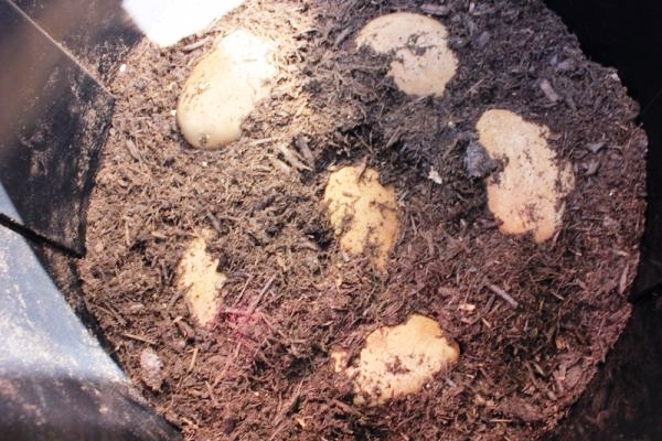 - Saupoudrer de bonne terre sur les tubercules. Également environ 10 cm Il est important de laisser suffisamment d'espace entre les tubercules pour qu'ils ne soient pas encombrés. Il existe également deux options pour le matériel de plantation : des pommes de terre entières ou coupées en morceaux peuvent être abaissées dans le baril.