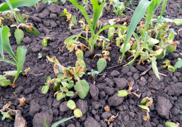 Si l'herbicide est appliqué sur le sol, la solution doit être soigneusement étalée sur la surface afin qu'elle ne pénètre pas plus bas que les grains plantés. Lors de l'utilisation de préparations de sol pour le maïs, il est nécessaire de faire attention aux conditions dans lesquelles elles sont actives. Par exemple, bon nombre de ces herbicides sont inactifs dans les sols secs. S'il n'y a pas de pluie, ou cela arrive très rarement, il y a une forte probabilité qu'au moment où le sol est humidifié, les composants actifs ont déjà disparu et leur introduction sera inutile. Ceci s'applique également aux préparations à base d'amine 2,4-D, dicamba, qui ne sont actives que dans les sols humides. De plus, ils peuvent être utilisés dans des termes strictement définis - lorsque 3 à 5 feuilles apparaissent sur les germes.