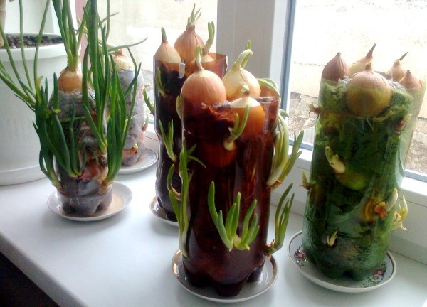 Le conteneur résultant avec des bulbes doit être placé sur une palette et placé sur un balcon ou un rebord de fenêtre. N'oubliez pas qu'un tel oignon doit être arrosé périodiquement. L'excès d'eau s'écoulera du récipient dans le puisard. Par conséquent, vous devez surveiller la présence d'eau et la verser à temps, sinon elle commencera simplement à déborder sur les bords. Après un certain temps, des plumes d'oignons verts apparaîtront des trous de la bouteille. Vous pouvez maintenant ajouter des vitamines à vos repas d'hiver.
